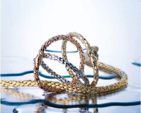 Trzy kolory złota, wykorzystywane w tej kolekcji, to bardzo popularne ostatnio rodowane złoto białe, tradycyjne żółte i ?powracające do łask? złoto czerwone, tworzące wyroby jednobarwne jak i mieszane. Dodatkowo łuskowate powierzchnie mogą być błyszczące lub satynowane, co podnosi dostojność wyrobów.